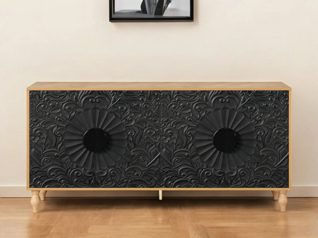 68" Natural and Black Distressed Carved Floral Sideboard with Four Doors