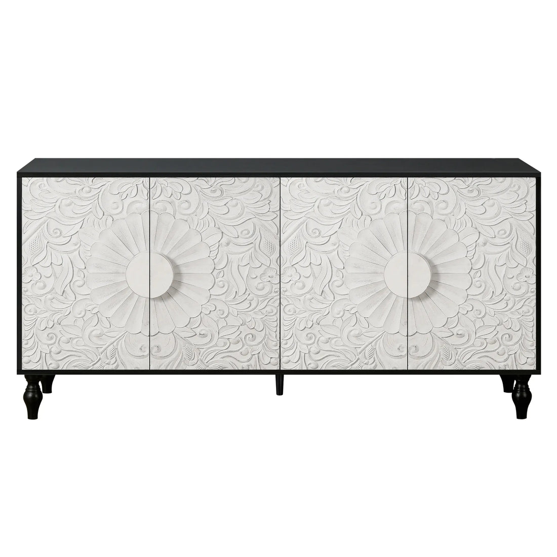 68" Black and White Distressed Carved Floral Sideboard with Four Doors