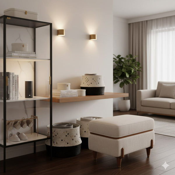 Hidden storage furniture, shelving, baskets, cord/cable management.