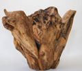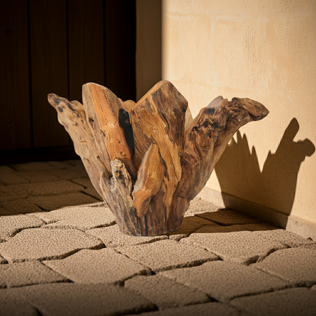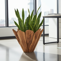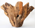 The vessel may be used as a decorative bowl, sculptural accent, or planter with a liner. Due to the natural characteristics of teak wood, variations in grain, tone, and surface texture are expected.