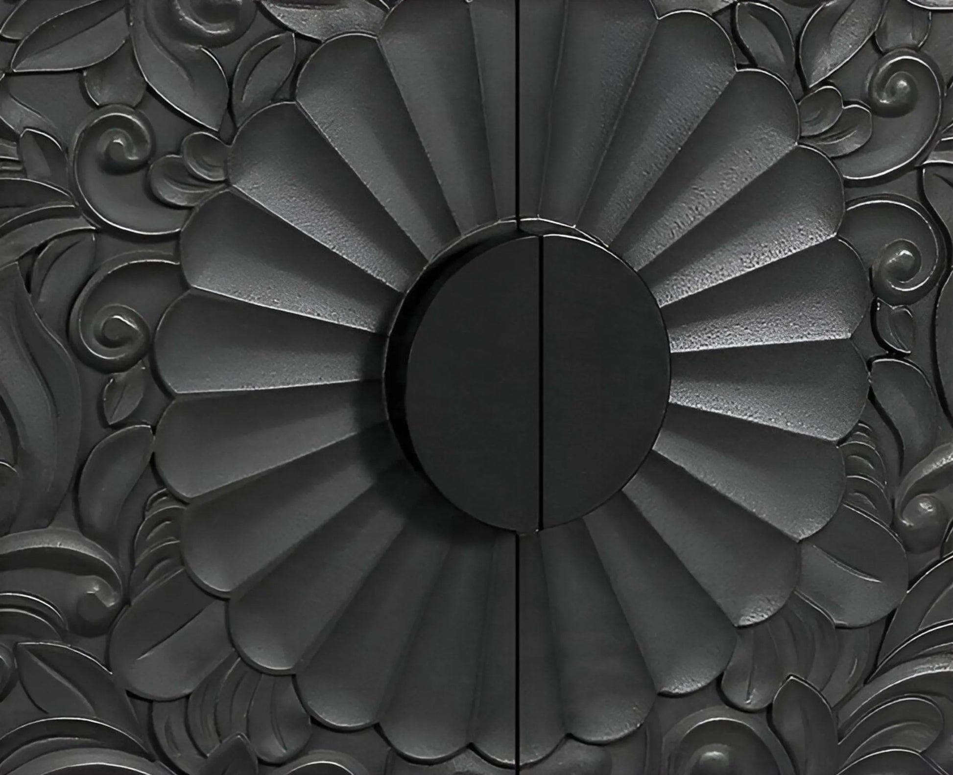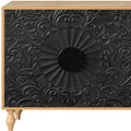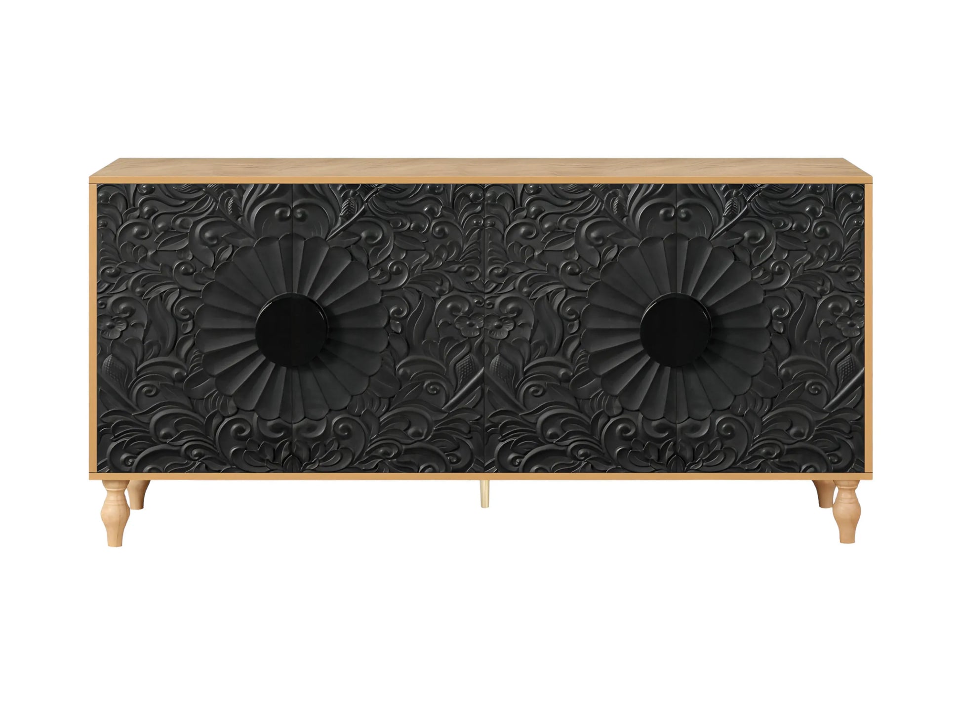 68" Natural and Black Distressed Carved Floral Sideboard with Four Doors
