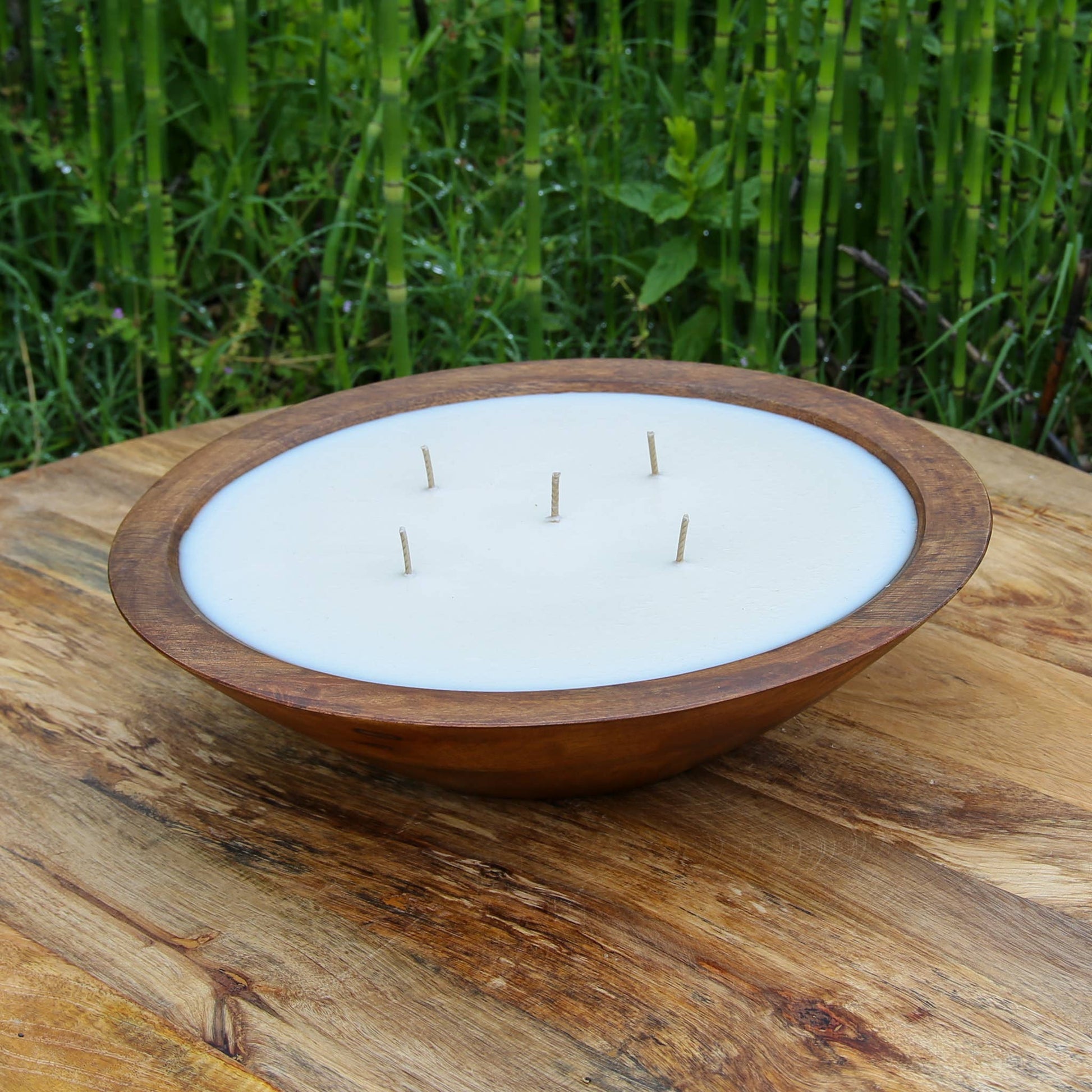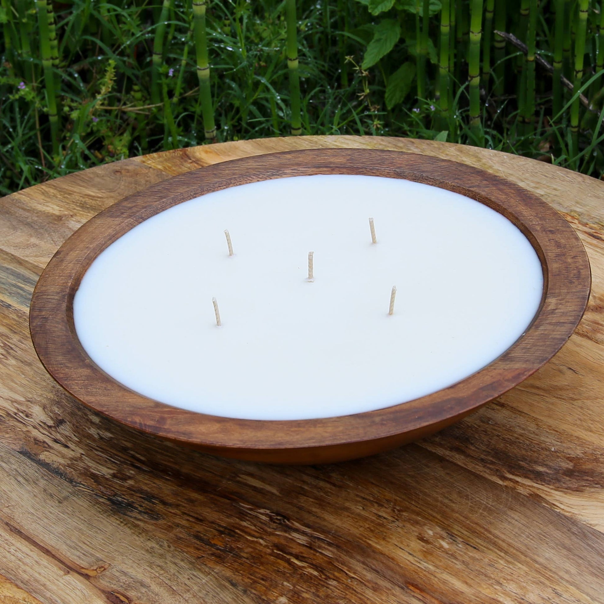 Elevate your space with this 12" Mango Wood Bowl Candle, a statement piece that blends clean-burning fragrance with sculptural design. Hand-poured with 2.5 lbs of natural soy wax and infused with essential oils, each candle is set in a sustainably sourced mango wood bowl—designed to be enjoyed indoors or outdoors. Five wicks provide an even burn and bold scent throw, creating a warm, inviting ambiance for up to 50 hours. Once finished, the bowl can be refilled or repurposed, making it as thoughtful as it is beautiful.