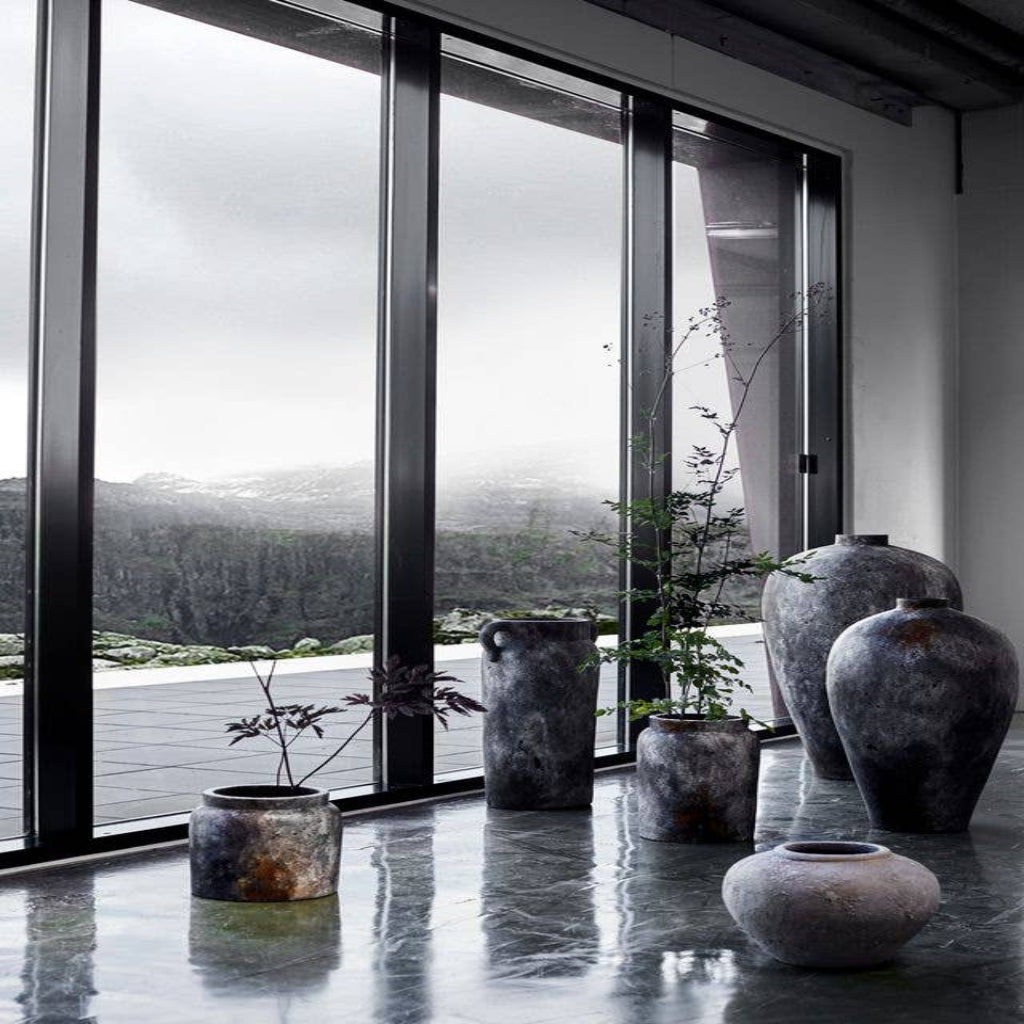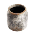 Each jar is handmade using a specialized finishing technique. The natural terracotta base is layered with black and white paint, then gently flame-treated to create its distinctive smoked, rust-grey surface. An antique finish is applied to enhance depth and character, and the piece is sealed with a protective coating for added durability.